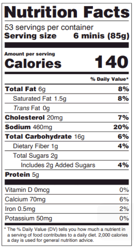INGREDIENTS: WATER, FISH PROTEIN (WATER, FISH PROTEIN [PROCESSED WHITE FISH MEAT {ALASKA POLLOCK}, SUGAR, SORBITOL, STABILIZER {SODIUM PYROPHOSPHATE, SODIUM TRIPOLYPHOSPHATE}], WHEAT STARCH, MODIFIED TAPIOCA STARCH, SUGAR, PALM OIL, SALT, CALCIUM CARBONATE, CRAB EXTRACT [FISH SAUCE EXTRACT {ANCHOVIES, SALT}, CRAB EXTRACT, WATER, SUGAR, TAPIOCA SYRUP, SOY SAUCE {SOY, SALT, WATER}, ETHYL ALCOHOL, SALT, GLYCEROL, RICE FLOUR, SODIUM RIBONUCLEOTIDES, XANTHAN GUM, NATURAL AND ARTIFICIAL FLAVORS], CRAB FLAVOR [NATURAL AND ARTIFICIAL FLAVORS, WATER, FRUCTOSE SYRUP, PROPYLENE GLYCOL, SALT, CRAB EXTRACT, DISODIUM INOSINATE, HYDROXYPROPYL METHYL CELLULOSE, CITRIC ACID, GLUCOSE SYRUP, POTASSIUM CHLORIDE], CARMINE, PAPRIKA OLEORESIN), BREAD CRUMBS (UNBLEACHED WHEAT FLOUR, SALT, YEAST), TEXTURED WHEAT PROTEIN (WATER, WHEAT PROTEIN, WHEAT FLOUR), SAUCE (FULLY REFINED SOYBEAN OIL, WATER, EGG YOLK, VINEGAR, SUGAR, MODIFIED CORN STARCH, MUSTARD, SALT), EGGS, YELLOW ONIONS, GREEN PEPPERS, RED PEPPERS, YELLOW MUSTARD (DISTILLED VINEGAR, WATER, MUSTARD SEED, SALT, TURMERIC, PAPRIKA, SPICE, NATURAL FLAVORS, GARLIC POWDER), SEASONING (CELERY SALT [SALT, CELERY SEED], SPICES [INCLUDING RED PEPPER AND BLACK PEPPER], PAPRIKA), BAKING POWDER (TAPIOCA STARCH, SODIUM ACID PYROPHOSPHATE, SODIUM BICARBONATE, MONOCALCIUM PHOSPHATE), FLAVOR ENHANCER (NATURAL FLAVOR, SALT, SILICON DIOXIDE, MALIC ACID), SUGAR, HOT SAUCE (DISTILLED VINEGAR, RED PEPPER, SALT), GARLIC POWDER, ONION POWDER, SPICES. CONTAINS: FISH (ALASKA POLLOCK, ANCHOVIES), CRUSTACEAN SHELLFISH (CRAB), WHEAT, EGGS, AND SOY.