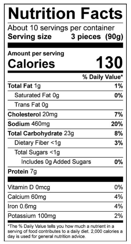 SOFT SHELL CRABS, BATTER (WATER, UNBLEACHED WHEAT FLOUR, CORN STARCH, RICE FLOUR, SEASONING [CELERY SALT {SALT, CELERY SEED}, SPICES {INCLUDING RED PEPPER AND BLACK PEPPER}, PAPRIKA], RAISING AGENTS [SODIUM ACID PYROPHOSPHATE, SODIUM BICARBONATE], GUAR GUM, XANTHAN GUM), BREAD CRUMBS (UNBLEACHED WHEAT FLOUR, PALM OIL SHORTENING, SUGAR, SALT, YEAST, DEXTROSE, ANNATTO EXTRACT), PRE-DUST (MODIFIED TAPIOCA STARCH [CONTAINS PERILLA OIL], RICE FLOUR,POTATO STARCH, SALT). CONTAINS: CRUSTACEAN SHELLFISH (CRAB) AND WHEAT.