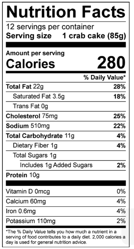 CRAB MEAT, SAUCE (FULLY REFINED SOYBEAN OIL, EGG AND EGG YOLK, WATER, SUGAR, VINEGAR, SALT, MUSTARD POWDER, ACETIC ACID, XANTHAN GUM), BREAD CRUMBS (UNBLEACHED WHEAT FLOUR, SALT, YEAST), EGGS, SCALLIONS, YELLOW MUSTARD (DISTILLED VINEGAR, WATER, MUSTARD SEED, SALT, TURMERIC, PAPRIKA, SPICE, NATURAL FLAVORS, GARLIC POWDER), SEASONING (SALT, SPICES, PAPRIKA, CHILI, MALTODEXTRIN), SPICES. PAR-FRIED IN FULLY REFINED SOYBEAN OIL.T