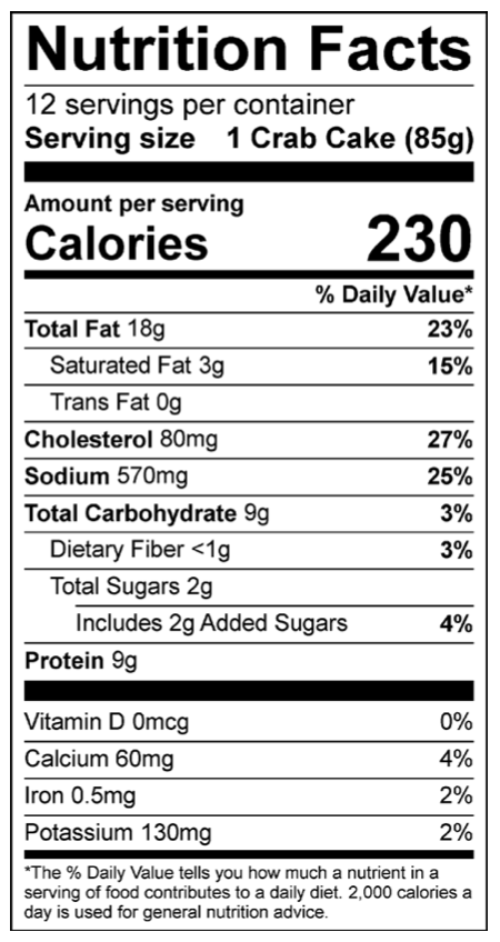 CRAB MEAT, SAUCE (FULLY REFINED SOYBEAN OIL, EGG AND EGG YOLK, WATER, SUGAR, VINEGAR, SALT, MUSTARD POWDER, ACETIC ACID, XANTHAN GUM), BREAD CRUMBS (UNBLEACHED WHEAT FLOUR, SALT, YEAST), EGGS, SCALLIONS, YELLOW MUSTARD (DISTILLED VINEGAR, WATER, MUSTARD SEED, SALT, TURMERIC, PAPRIKA, SPICE, NATURAL FLAVORS, GARLIC POWDER), SEASONING (SALT, SPICES, PAPRIKA, CHILI, MALTODEXTRIN), SPICES. PAR-FRIED IN FULLY REFINED SOYBEAN OIL.
