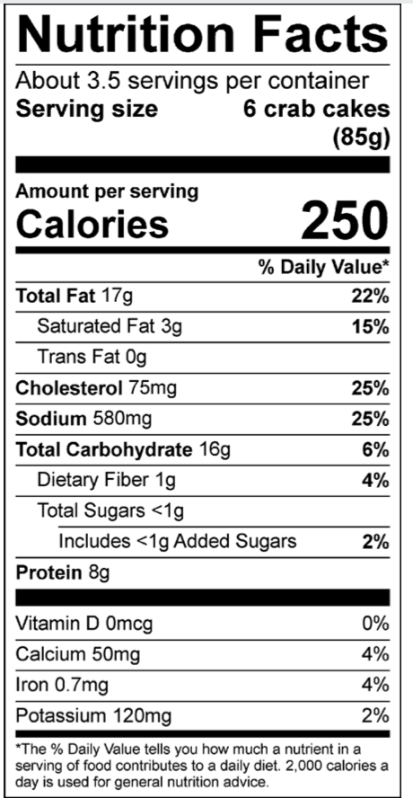 INGREDIENTS: CRAB MEAT, SAUCE (FULLY REFINED SOYBEAN OIL, WATER, EGG YOLK, VINEGAR, SUGAR, MODIFIED CORN STARCH, MUSTARD, SALT), BREAD CRUMBS (UNBLEACHED WHEAT FLOUR, SALT, YEAST), EGGS, SCALLIONS, SEASONING (CELERY SALT [SALT, CELERY SEED], SPICES [INCLUDING RED PEPPER AND BLACK PEPPER], PAPRIKA), PARSLEY. CONTAINS: CRUSTACEAN SHELLFISH (CRAB), EGGS, AND WHEAT.