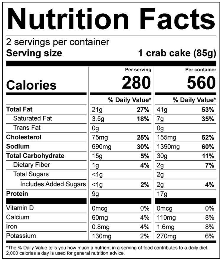 CRAB MEAT, SAUCE (FULLY REFINED SOYBEAN OIL, WATER, EGG YOLK, VINEGAR, SUGAR, MODIFIED CORN STARCH, MUSTARD, SALT), BREAD CRUMBS (UNBLEACHED WHEAT FLOUR, SALT, YEAST), EGGS, SCALLIONS, SEASONING (CELERY SALT [SALT, CELERY SEED], SPICES [INCLUDING RED PEPPER AND BLACK PEPPER], PAPRIKA), PARSLEY. CONTAINS: CRUSTACEAN SHELLFISH (CRAB), EGGS, AND WHEAT.