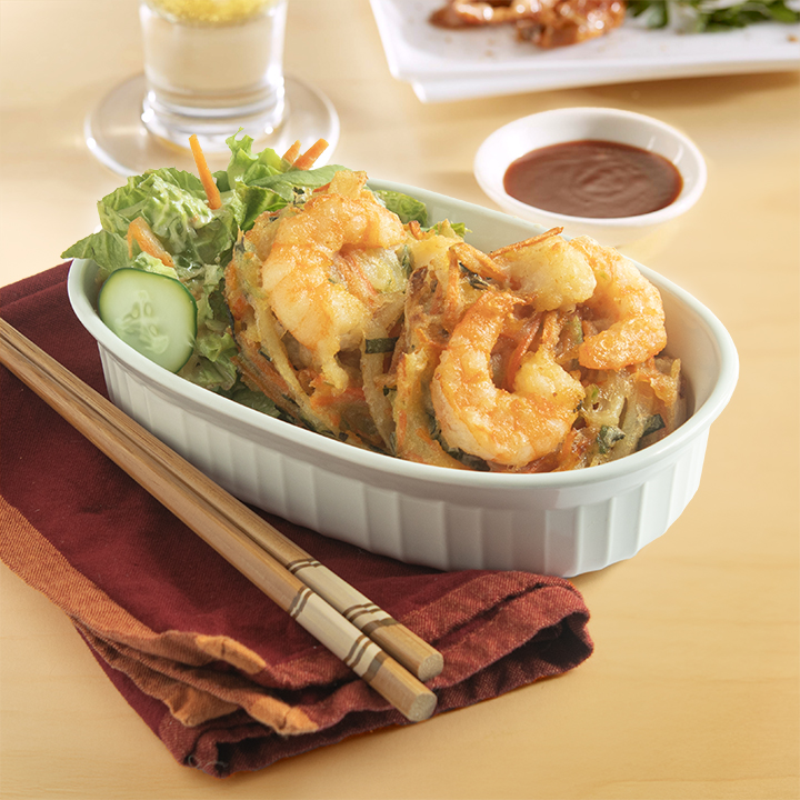 Combine green salad ingredients and toss with ginger dressing. Once cooked, serve the Shrimp Birds’ Nests with the green salad. Drizzle with the included Tangy Chili Sauce for a boost of flavor. Enjoy!