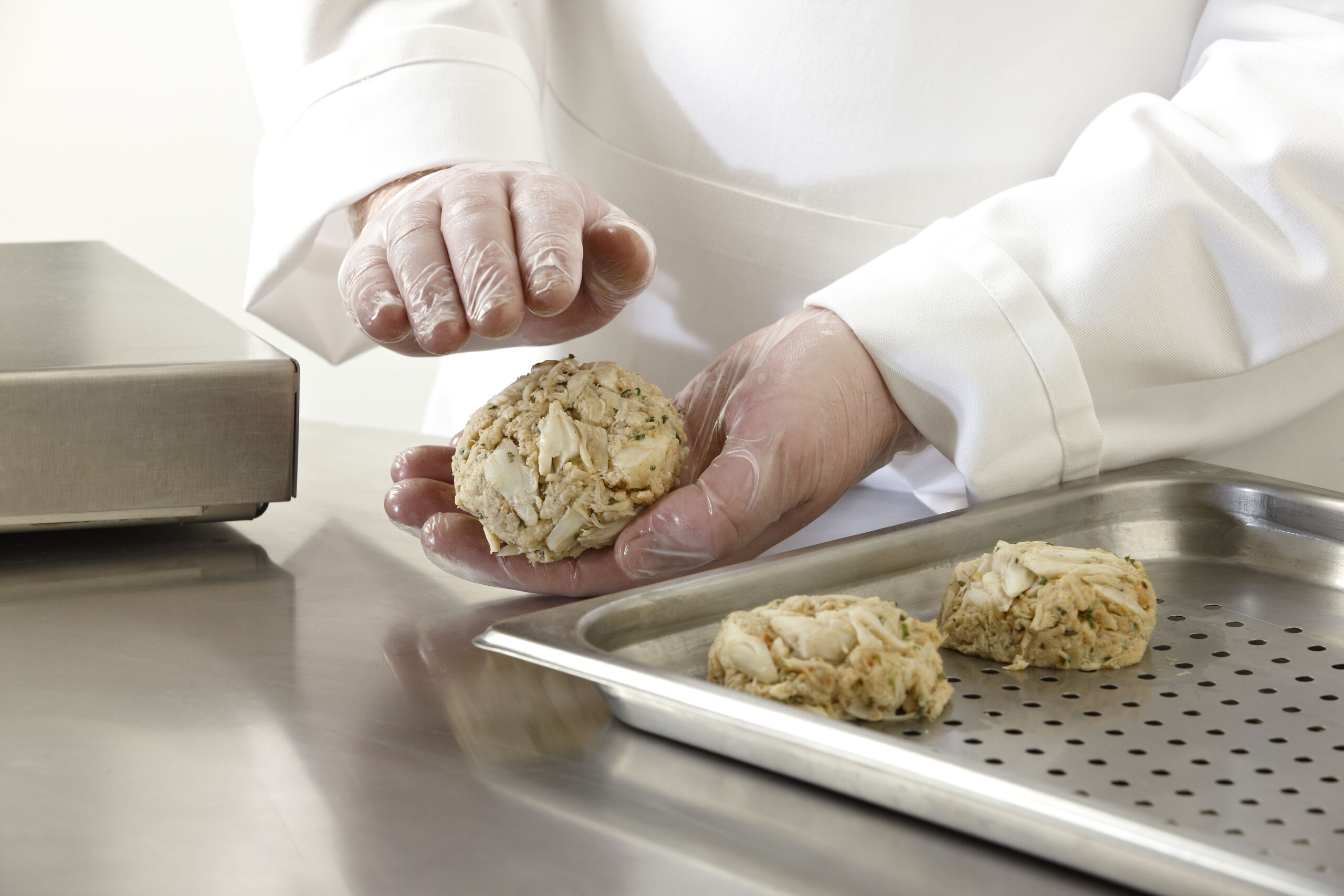 A good crab cake has a high ratio of crab meat to filler, and the crab is mixed gently to keep the lumps intact.