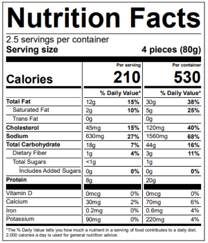 INGREDIENTS: SHRIMP (SHRIMP, WATER, SODIUM TRIPOLYPHOSPHATE, SALT), BATTER (WATER, UNBLEACHED WHEAT FLOUR, SALT, VINEGAR, CITRIC ACID, YEAST EXTRACT, CHILI, RAISING AGENTS [SODIUM ACID PYROPHOSPHATE, SODIUM BICARBONATE], ONION POWDER, CAPSICUM, GARLIC POWDER, GUAR GUM, CELERY, ARTIFICIAL FLAVORING), BREADER (UNBLEACHED WHEAT FLOUR, BREAD CRUMB [UNBLEACHED WHEAT FLOUR, SALT, YEAST, SUGAR], RAISING AGENTS [SODIUM ACID PYROPHOSPHATE, SODIUM BICARBONATE], SALT, YEAST EXTRACT, PARSLEY, PAPRIKA OLEORESIN), PRE- DUST (MODIFIED TAPIOCA STARCH, UNBLEACHED WHEAT FLOUR, SALT, VINEGAR, CITRIC ACID, YEAST EXTRACT, SUGAR, CHILI, ONION POWDER, GARLIC POWDER, CELERY, ARTIFICIAL FLAVORING, JALAPEÑO PEPPER). PAR-FRIED IN FULLY REFINED SOYBEAN OIL